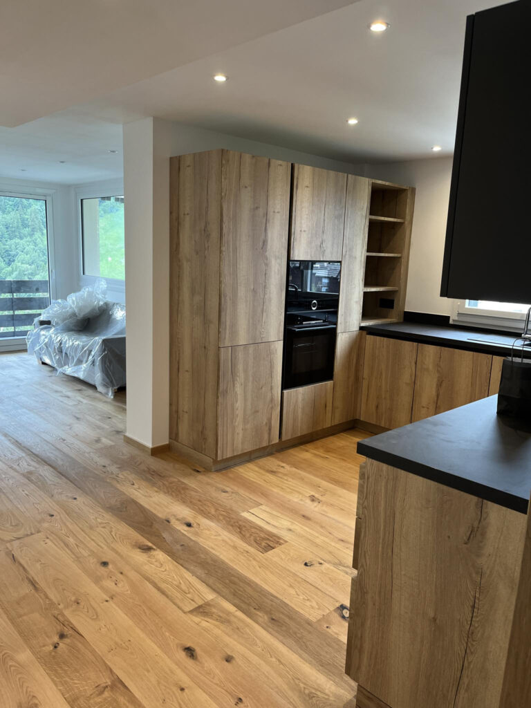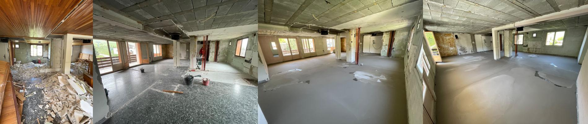 Ce panorama illustre les différentes étapes d’un chantier de rénovation lourde : de la démolition intérieure, au gros œuvre et à la remise à neuf des sols et des espaces. Il met en avant le savoir-faire de Concept Alpin dans la transformation complète d’appartements et chalets, du démontage initial jusqu’à la reconstruction et les finitions.